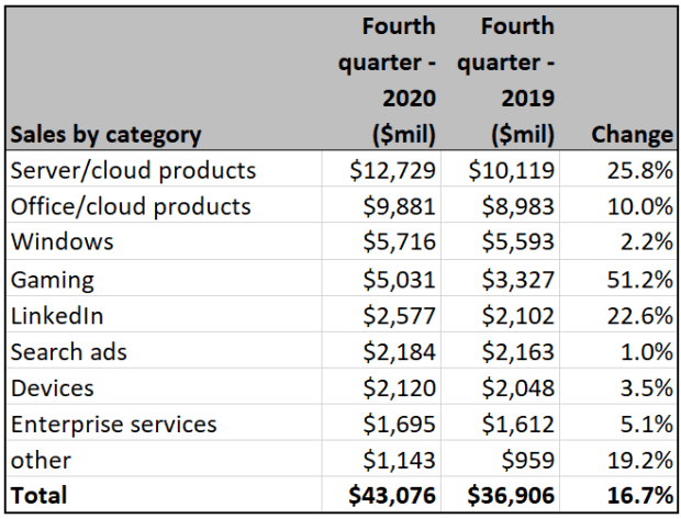 Les produits serveurs et offres cloud de Microsoft, une activité de 41,4 milliards de dollars l'année dernière, ont augmenté de 25,8% au quatrième trimestre. La gamme de produits la plus populaire est les services cloud Azure. Les clients aiment Azure car cela les aide à devenir plus productifs et compétitifs. Ils continueront donc à se joindre et à étendre l'utilisation lorsqu'ils se connecteront.